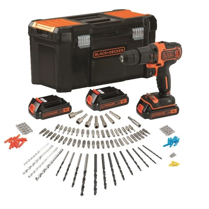 Kraftfuld slagboremaskine fra Black & Decker inkl. 3 x 1.5 Ah batterier, 1 x hurtiglader samt 120 stk. tilbehør i robust værktøjskasse.