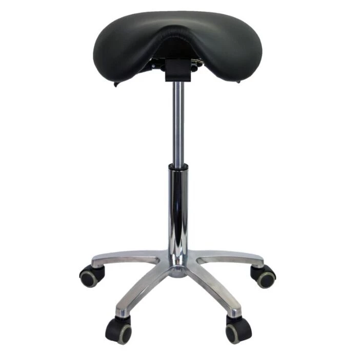 Ergonomisk højdejusterbar sadelstol med sort sæde og langtidsholdbare universalhjul.