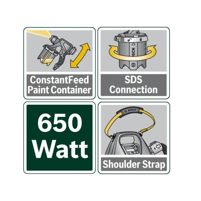 Sprøjtepistolen PFS 3000-2 har en ALLPaint-teknologi, der giver en enkel sprøjtemaling med alle typer malinger. Dens praktiske SDS-system gør efterfyldning af maling meget hurtig, og det gør rengøringen nem og enkel.