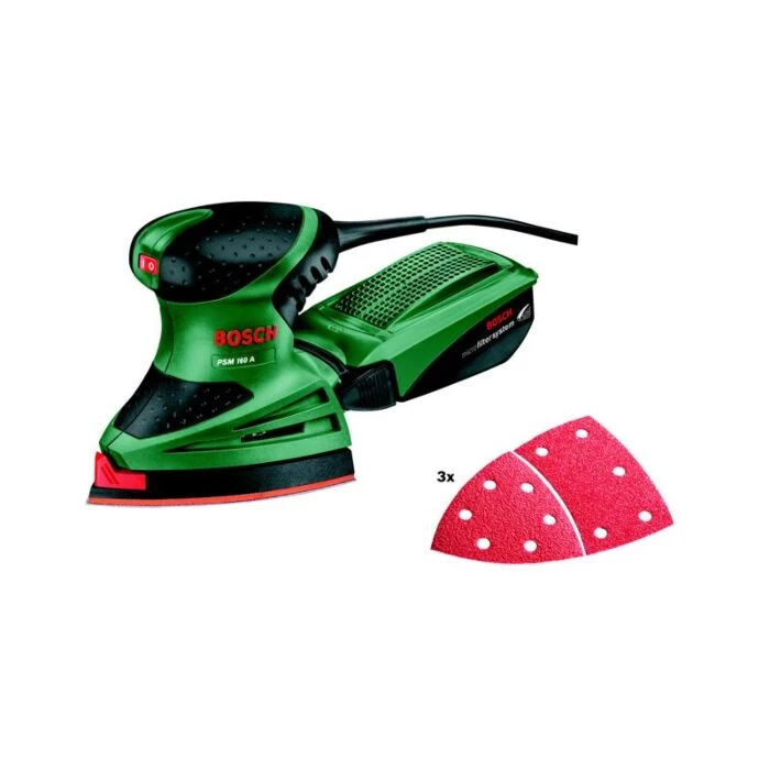 Kraftfuld slibemaskine fra Bosch med 160 W-motor. Slibemaskinen sliber og polerer også på steder med lidt plads og på små overflader. Der er indbygget filtersystem, som suger støvet op i den medfølgende filterboks.