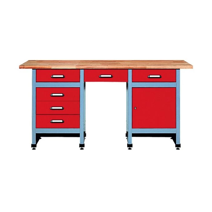 Praktisk arbejdsbord til værkstedet fremstillet i pulverlakeret metal og bøgetræ med 1 skab samt 6 skuffer.