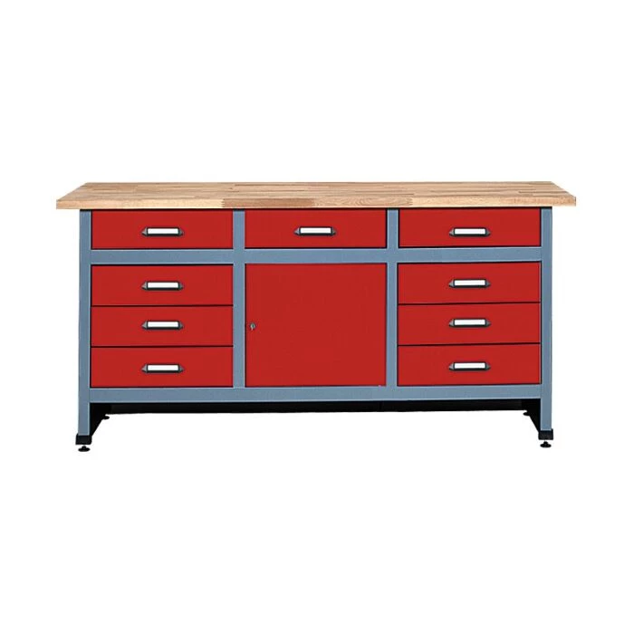 Praktisk arbejdsbord til værkstedet fremstillet i pulverlakeret metal med bøgetræsbordplade. Bordet har en låge til et skab samt ni skuffer.