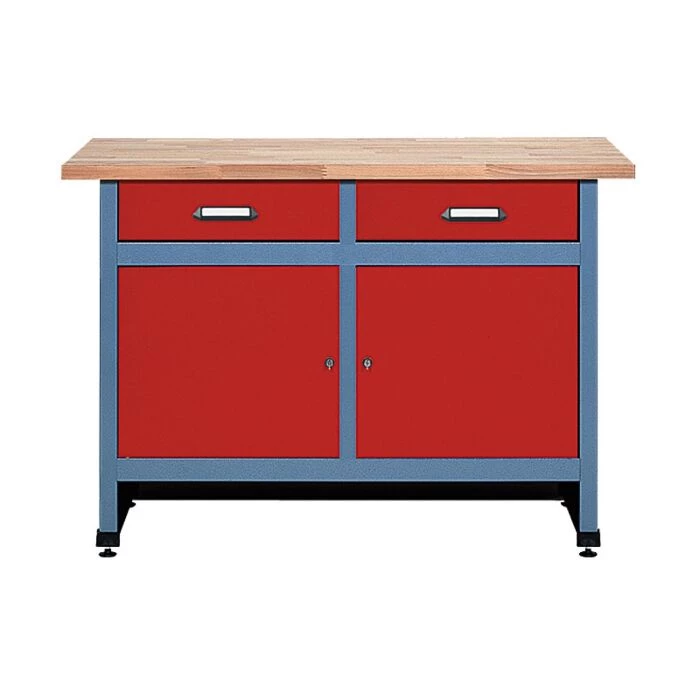 Praktisk arbejdsbord til værkstedet fremstillet i pulverlakeret metal og bøgetræ med 2 låger til 1 skab samt 2 skuffer.