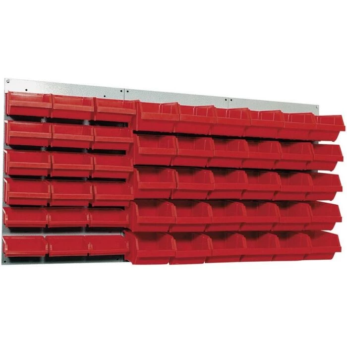 Praktisk stålpanel med sorteringsbokse til opbevaring af skruer, bits og andre småting i værkstedet.