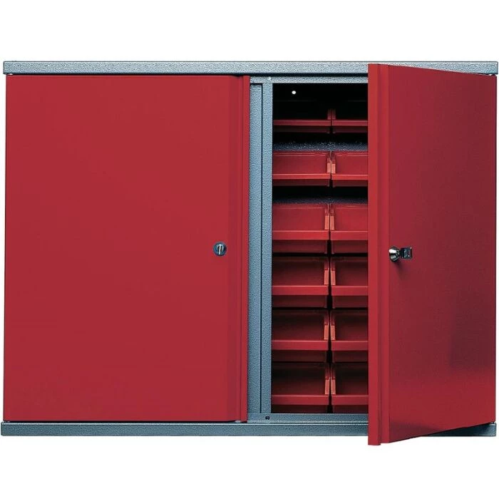 Vægskabet er udstyret med 36 sorteringsbokse til opbevaring af skruer, bits og andet småværktøj.