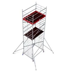 Stilladset er udstyret med fire stabile og højdejusterbare hjul, som er meget praktiske ved ujævnt underlag. Trinene er centralt svejset, hvilket gør dem yderst modstandsdygtige over for bøjninger.