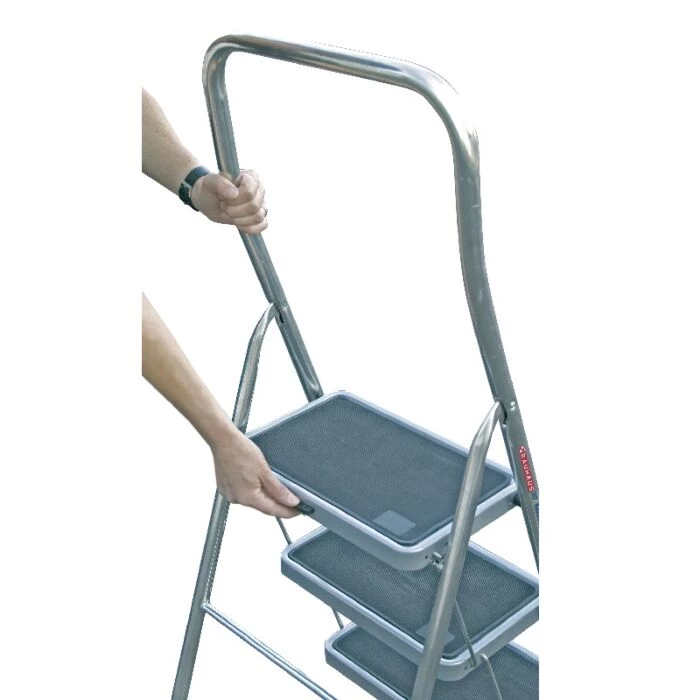 En klassisk trappestige med kun to trin som er lavet i aluminium. Trinene er beklædt med gummi, så du står ekstra godt og skridsikkert fast, når stigen er i brug.