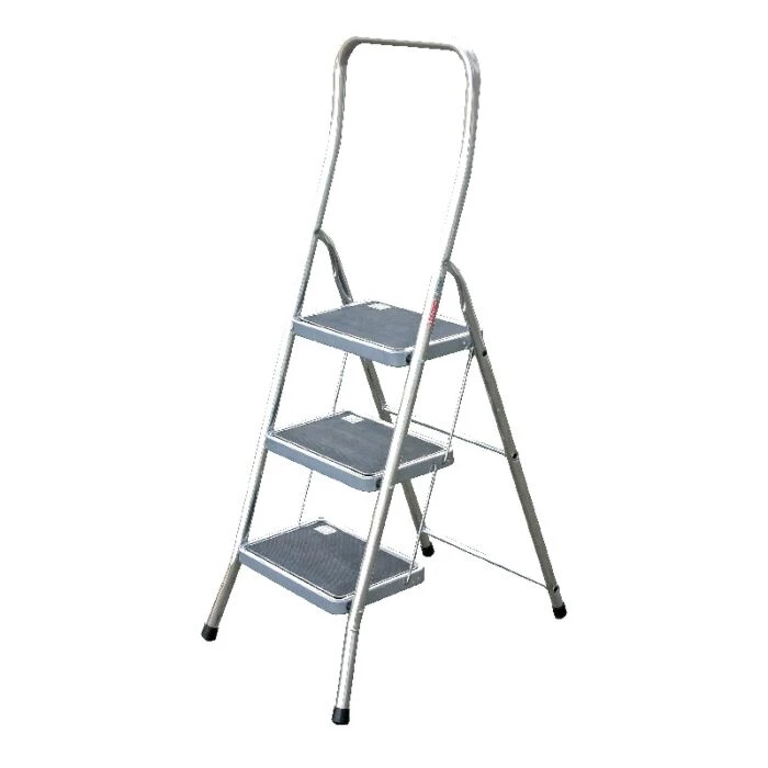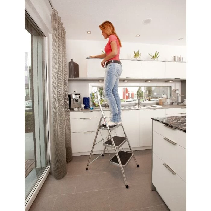 En klassisk trappestige med kun trin lavet i aluminium. Trinene er beklædt med gummi, så du står ekstra godt og skridsikkert fast.
