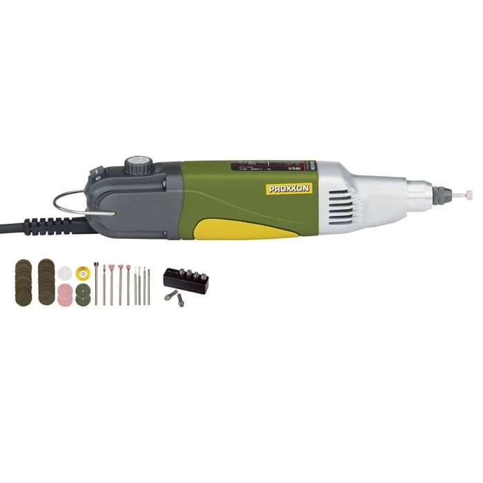 Der medfølger seks tredelt slidsede MICROMOT stålspændetænger, 1,0 – 1,5 – 2,0 – 2,4 – 3,0 og 3,2 mm inkl. spændemøtrik. Derudover medfølger der 34 bits og skær i industriel kvalitet. Alt dette kan transporteres rundt i den medfølgende kuffert.