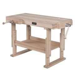 Høvlebænk designet til børn i alderen 3-12 år med en hylde og to skruestik. Den er nem at justere i højden 62-77 cm, alt efter barnets størrelse. Bænken er fremstillet i bøgetræ med børnemotiver på skruenøglen.