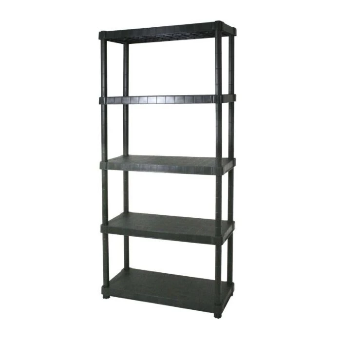Enkel og praktisk plastreol med fem hylder og masser af opbevaringsplads.