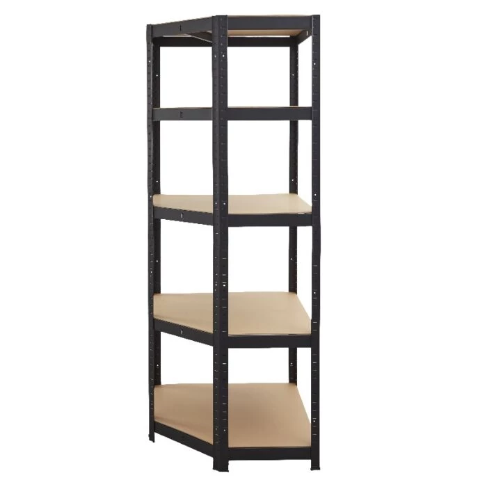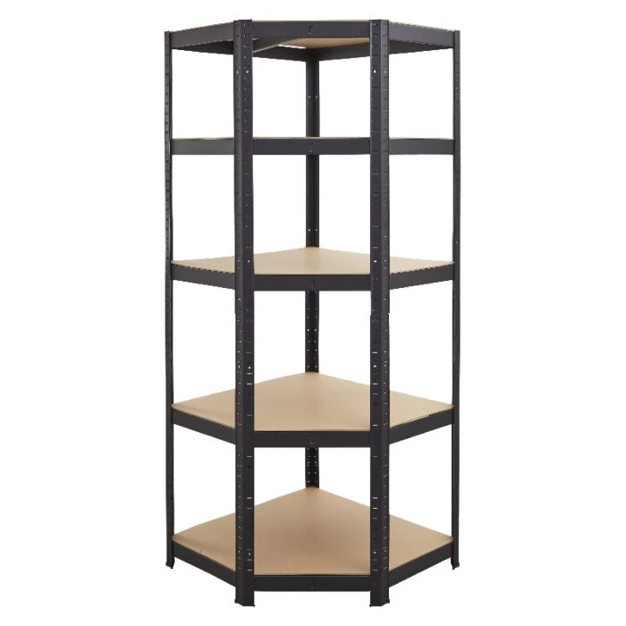 Stærk hjørnereol i sortlakeret stål med fem hylder i MDF med en bæreevne på 175 kg pr. hylde.