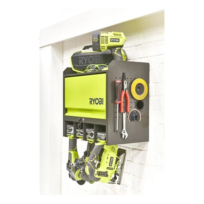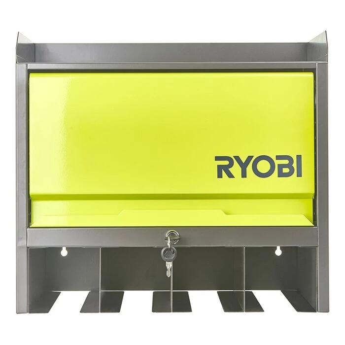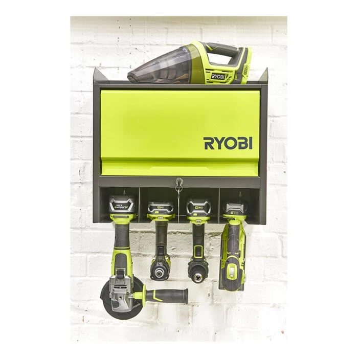 Robust værktøjsskab i stål til batteridrevne værktøjer fra Ryobi.