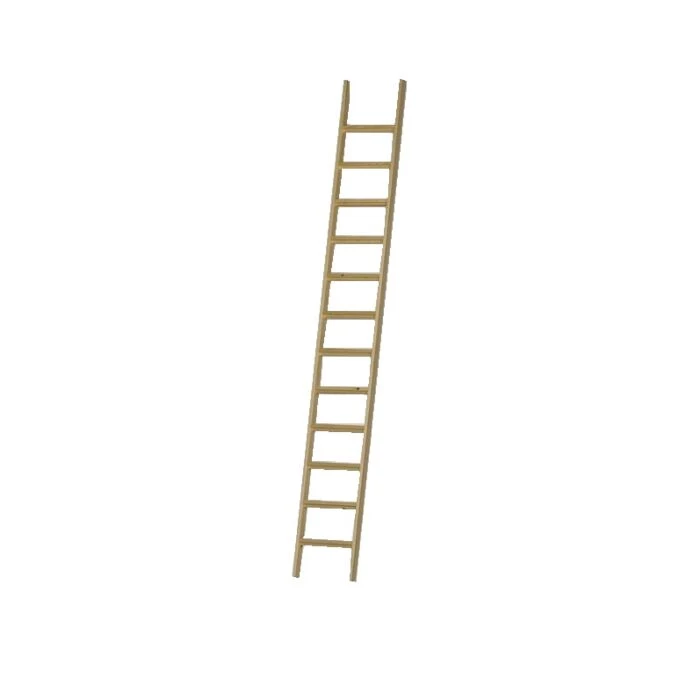 En hemsetrappe i ubehandlet træ med laminerede vanger. Hemsetrappen har 11 brede trin og kortere afstand mellem trinnene sammenlignet med almindelige enkeltstiger.