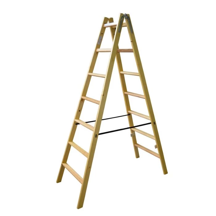 En wienerstige i fyrretræ med massive vanger og bændler. Stigen måler 2,08 meter i højden og er udstyret med 7 brede ergo-trin. De to øverste trin er vendt på højkant med en vandret trædeflade, hvilket sikrer en mere sikker og ergonomisk korrekt arbejdsstilling ved arbejde med et ben på hver side af stigen.