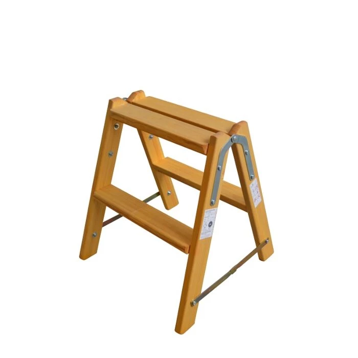 En wienertrappe i fyrretræ med laminerede vanger med skærehængsler. Trappen har 2 trin som er udstyret med understøtning i asketræ.