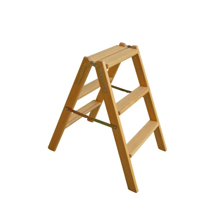 En wienertrappe i fyrretræ med laminerede vanger med skærehængsler. Trappen har 3 trin som er udstyret med understøtning i asketræ.